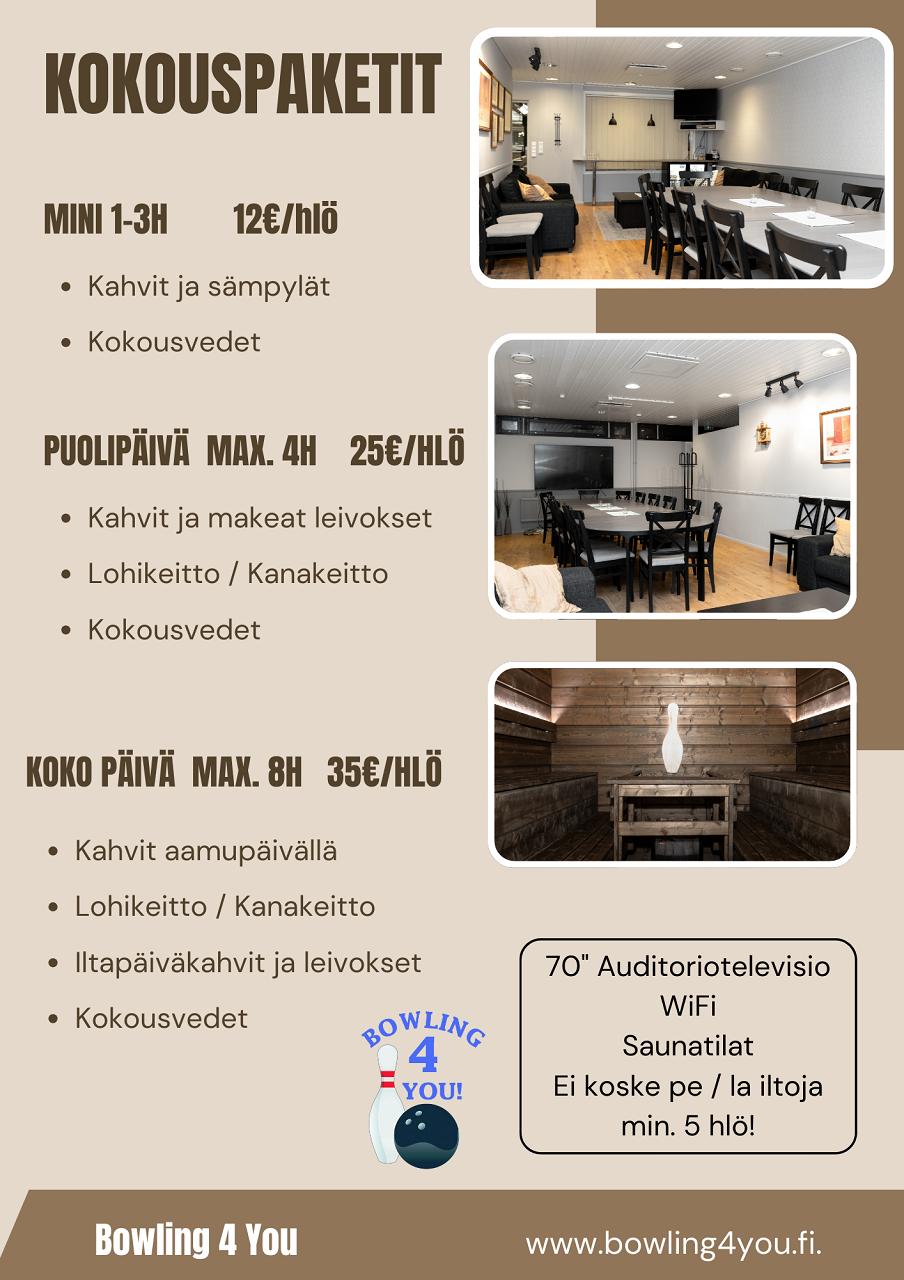 Kokouksiin ja saunailtoja varten on mahdollista tilata tarjoilut ennakkoon. Tiloissa on A-oikeudet, joten juomapuolikin on kunnossa – omia alkoholijuomia ei hallille saa tuoda. Jos keilailu maistuu tapaamisen lomassa, pääsee radalle tietenkin etuhintaan.